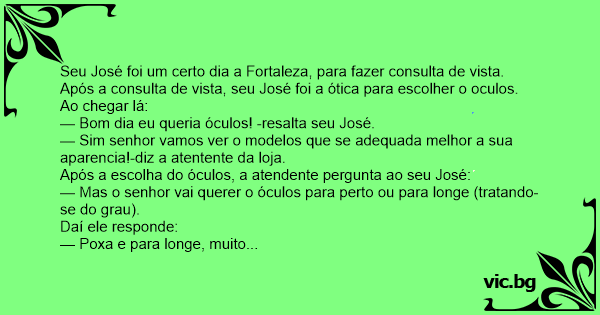 Seu José foi um certo dia a Fortaleza, para fazer consulta de vista. Após a consulta de vista, seu José foi a ótica para escolher o oculos.