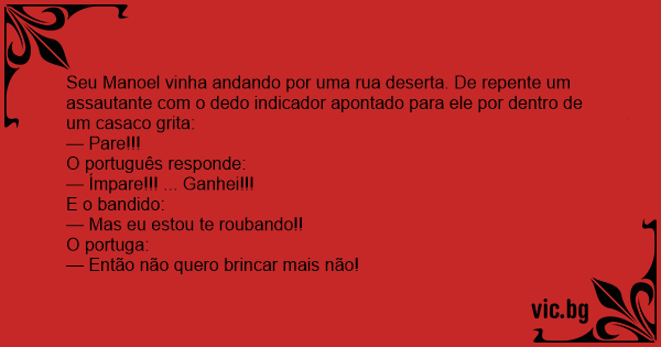 Seu Manoel vinha andando por uma rua deserta. De repente um assautante com o dedo indicador apontado para ele por dentro de um casaco grita: