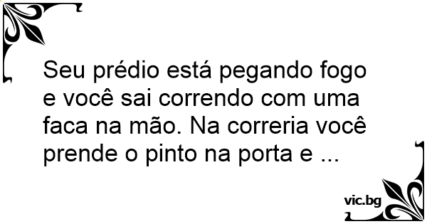 Seu prédio está pegando fogo e você sai correndo com uma faca na mão. Na correria você prende o pinto na porta e ...