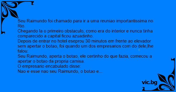 Passou 15 minutos o elevador chegou,ele entrou o homem que atende no elevador o conduziu para o se andar ,entao seu raimundo ofegante pega a carteira e prestes a tirar o dinheiro o condutor fala sem graca e constrangido: