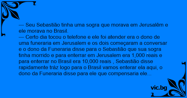 — Certo dia tocou o telefone e ele foi atender era o dono de uma funeraria em Jerusalem e os dois começaram a conversar e o dono da Funeraria disse para o Sebastião que sua sogra tinha morrido e para enterrar em Jerusalem era 1,000 reais e para enterrar no Brasil era 10,000 reais , Sebastião disse rapidamente tráz logo para o Brasil vamos enterar ela aqui, o dono da Funeraria disse para ele que compensaria ele interrar em Jerusalem mesmo, Sebastião disse interrompendo-lhe o dono da Funeraria: