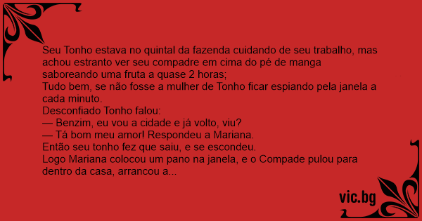 Seu Tonho estava no quintal da fazenda cuidando de seu trabalho, mas achou estranto ver seu compadre em cima do pé de manga saboreando uma fruta a quase 2 horas;