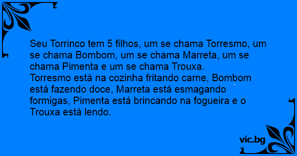 Seu Torrinco tem 5 filhos, um se chama Torresmo, um se chama Bombom, um se chama Marreta, um se chama Pimenta e um se chama Тrоuxа.
