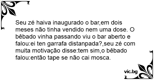 Seu zé haiva inaugurado o bar,em dois meses não tinha vendido nem uma dose. O bêbado vinha passando viu o bar aberto e falou:ei ten garrafa distanpada?,seu zé com muita motivação disse:tem sim,o bêbado falou:então tape se não cai mosca.