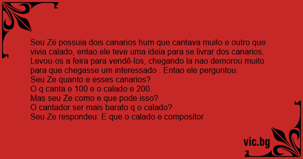 Seu Zé possuia dois canarios hum que cantava muito e outro que vivia calado, entao ele teve uma ideia para se livrar dos canarios. Levou-os a feira para vendê-los, chegando la nao demorou muito para que chegasse um interessado . Entao ele perguntou: