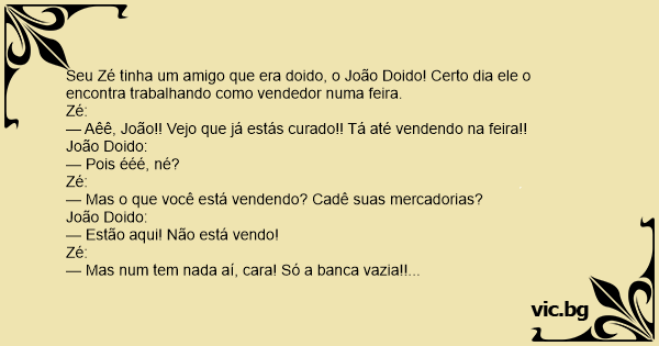 Seu Zé tinha um amigo que era doido, o João Doido! Certo dia ele o encontra trabalhando como vendedor numa feira.