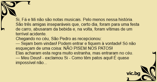 — Não adianta se lamentar! - disse São Pedro - ao lado de um homem ainda mais feio. E lá se foi Fá cumprir sua eterna pena.