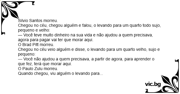 Chegou no céu veio alguém e disse, o levando para um quarto velho, sujo e pequeno: