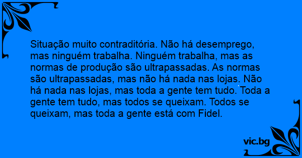 Situação muito contraditória. Não há desemprego, mas ninguém trabalha. Ninguém trabalha, mas as normas de produção são ultrapassadas. As normas são ultrapassadas, mas não há nada nas lojas. Não há nada nas lojas, mas toda a gente tem tudo. Toda a gente tem tudo, mas todos se queixam. Todos se queixam, mas toda a gente está com Fidel.