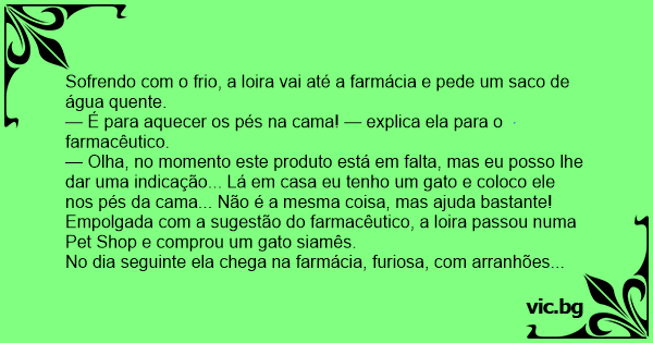 Sofrendo com o frio, a loira vai até a farmácia e pede um saco de água quente.