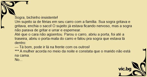 Até que o cara não agüentou. Parou o carro, abriu a porta, foi até a traseira, abriu o porta-mala do carro e falou pra sogra que estava lá dentro: