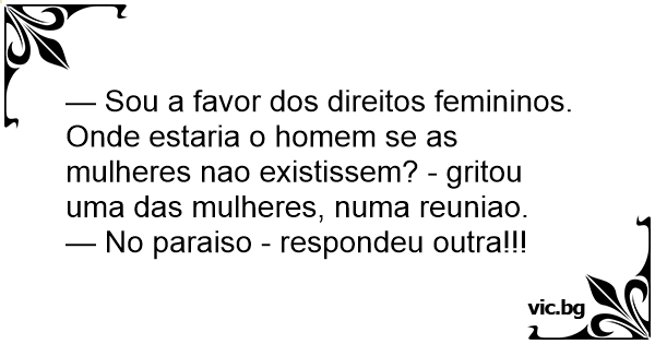 — Sou a favor dos direitos femininos. Onde estaria o homem se as mulheres nao existissem? - gritou uma das mulheres, numa reuniao.