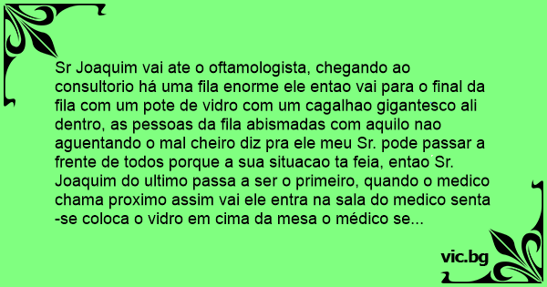 Sr Joaquim vai ate o oftamologista, chegando ao consultorio há uma fila enorme ele entao vai para o final da fila com um pote de vidro com um cagalhao gigantesco ali dentro, as pessoas da fila abismadas com aquilo nao aguentando o mal cheiro diz pra ele meu Sr. pode passar a frente de todos porque a sua situacao ta feia, entao Sr. Joaquim do ultimo passa a ser o primeiro, quando o medico chama proximo assim vai ele entra na sala do medico senta-se coloca o vidro em cima da mesa o médico se assusta e diz: