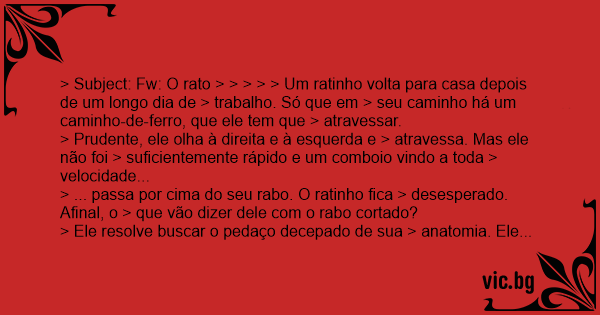 > ... passa por cima do seu rаво. O ratinho fiса > desesperado. Afinal, o > que vão dizer dele com o rаво cortado?