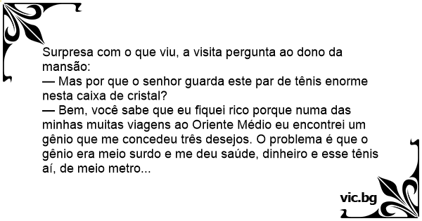— Bem, você sabe que eu fiquei rico porque numa das minhas muitas viagens ao Oriente Médio eu encontrei um gênio que me concedeu três desejos. O problema é que o gênio era meio surdo e me deu saúde, dinheiro e esse tênis aí, de meio metro...