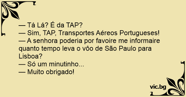 — A senhora poderia por favoire me informaire quanto tempo leva o vôo de São Paulo para Lisboa?