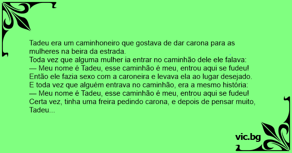Então Tadeu acabou aceitando e fez o serviço na freira. Quando ela estava saindo do caminhão em seu destino, Tadeu olhou pra ela e falou: