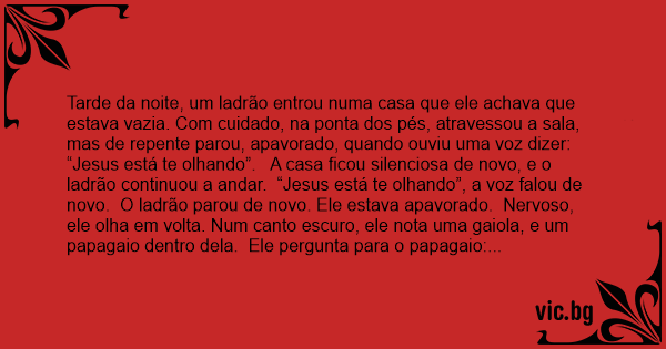 “Jesus está te olhando”. A casa ficou silenciosa de novo, e o ladrão continuou a andar. “Jesus está te olhando”, a voz falou de novo. O ladrão parou de novo. Ele estava apavorado. Nervoso, ele olha em volta. Num canto escuro, ele nota uma gaiola, e um papagaio dentro dela. Ele pergunta para o papagaio: