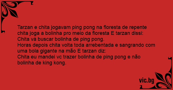 Tarzan e chita jogavam ping pong na floresta de repente chita joga a bolinha pro meio da floresta E tarzan dissi: