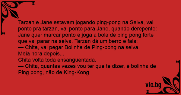 Tarzan e Jane estavam jogando ping-pong na Selva, vai ponto pra tarzan, vai ponto para Jane, quando derepente: Jane quer marcar ponto e joga a bola de ping pong forte que vai parar na selva. Tarzan dá um berro e fala: