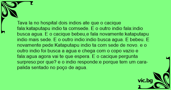 Tava la no hospital dois indios ate que o cacique fala:kataputapu indio ta comsede. E o outro indio fala:indio busca agua. E o cacique bebeu,e fala novamente:kataputapu indio mais sede. E o outro indio:indio busca agua. E bebeu. E novamente pede:Kataputapu indio ta com sede de novo. e o outro indio foi busca a agua e chega com o copo vazio e fala:agua agora vai te que espera. E o cacique pergunta surpreso:por que? e o indio responde:e porque tem um cara-palida sentado no poço de agua.