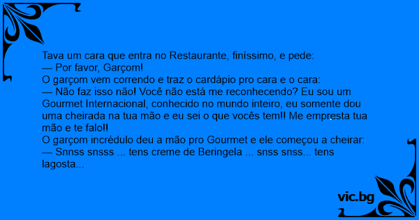 — Garçom, você não está me reconhecendo?? Eu sou o Gourmet internacional que esteve aqui ontem e somente ao cheirar tua mão eu sei o que vocês tem.