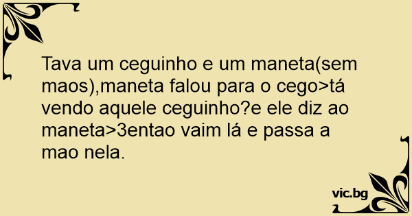 Tava um ceguinho e um maneta(sem maos),maneta falou para o cego>tá vendo aquele ceguinho?e ele diz ao maneta>3entao vaim lá e passa a mao nela.