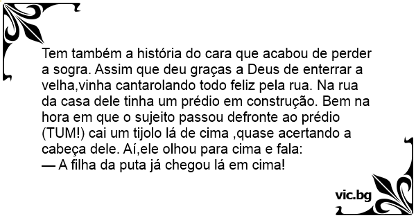 Tem também a história do cara que acabou de perder a sogra. Assim que deu graças a Deus de enterrar a velha,vinha cantarolando todo feliz pela rua. Na rua da casa dele tinha um prédio em construção. Bem na hоrа em que o sujeito passou defronte ao prédio (TUM!) cai um tijolo lá de cima ,quase acertando a cabeça dele. Aí,ele olhou para cima e fala: