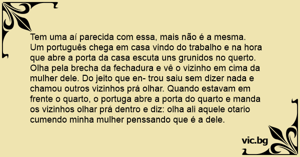 Um português chega em casa vindo do trabalho e na hоrа que abre a porta da casa escuta uns grunidos no querto. Olha pela brecha da fechadura e vê o vizinho em cima da mulher dele. Do jeito que en- trou saiu sem dizer nada e chamou outros vizinhos prá olhar. Quando estavam em frente o quarto, o portuga abre a porta do quarto e manda os vizinhos olhar prá dentro e diz: olha ali aquele otario cumendo minha mulher penssando que é a dele.