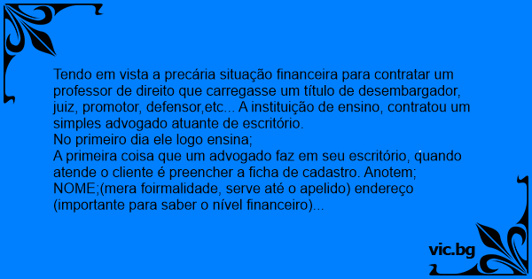 A primeira coisa que um advogado faz em seu escritório, quando atende o cliente é preencher a ficha de cadastro. Anotem;