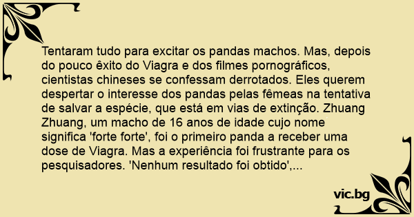 Tentaram tudo para excitar os pandas machos. Mas, depois do pouco êxito do Viаgrа e dos filmes pornográficos, cientistas chineses se confessam derrotados. Eles querem despertar o interesse dos pandas pelas fêmeas na tentativa de salvar a espécie, que está em vias de extinção. Zhuang Zhuang, um macho de 16 anos de idade cujo nome significa 'forte forte', foi o primeiro panda a receber uma dose de Viаgrа. Mas a experiência foi frustrante para os pesquisadores. 'Nenhum resultado foi obtido', conta Wаng Pengyan, vice-diretor da reserva de Wolong, no sudoeste da China, onde os cientistas tentam fazer os pandas se reproduzirem, recorrendo, quando não lhes restam alternativas, à inseminação artificial.