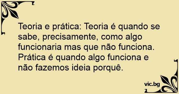 Teoria e prática: Teoria é quando se sabe, precisamente, como algo funcionaria mas que não funciona. Prática é quando algo funciona e não fazemos ideia porquê.