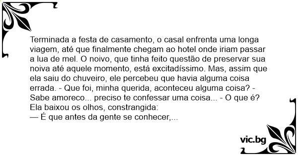 Terminada a festa de casamento, o casal enfrenta uma longa viagem, até que finalmente chegam ao hotel onde iriam passar a lua de mel. O noivo, que tinha feito questão de preservar sua noiva até aquele momento, está excitadíssimo. Mas, assim que ela saiu do chuveiro, ele percebeu que havia alguma coisa errada. - Que foi, minha querida, aconteceu alguma coisa? - Sabe amoreco... preciso te confessar uma coisa... - O que é? Ela baixou os olhos, constrangida: