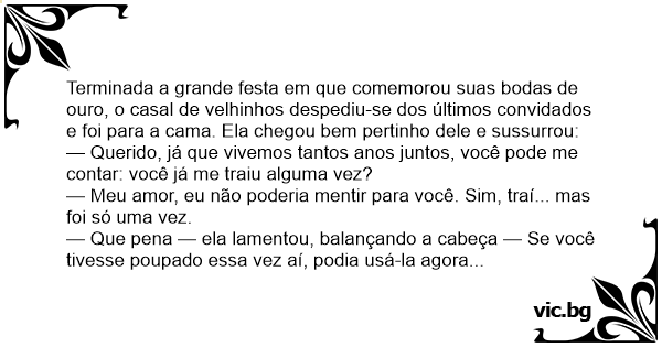 Terminada a grande festa em que comemorou suas bodas de ouro, o casal de velhinhos despediu-se dos últimos convidados e foi para a cama. Ela chegou bem pertinho dele e sussurrou: