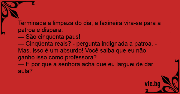 — Cinqüenta reais? - pergunta indignada a patroa. - Mas, isso é um absurdo! Você saiba que eu não ganho isso como professora?