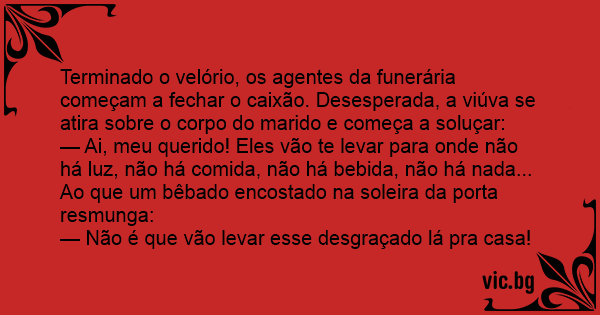 Terminado o velório, os agentes da funerária começam a fechar o caixão. Desesperada, a viúva se atira sobre o corpo do marido e começa a soluçar: