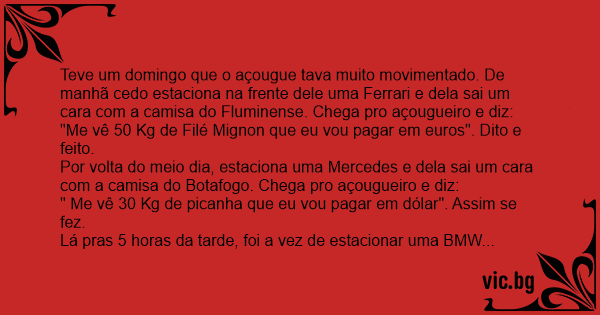 Aí la pras 7 e meia da noite, quando o coitado do açougueiro já tava fechando sua loja, estaciona um Corcel 2 1978, daqueles cheio de adesivo escrito " é Deus no céu e nóis no Corcel", e dele sai um torcedor do mengão! Chega pro açougueiro e diz:
