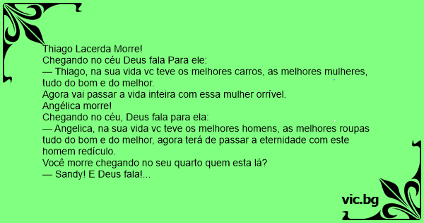 — Angelica, na sua vida vc teve os melhores homens, as melhores roupas tudo do bom e do melhor, agora terá de passar a eternidade com este homem redículo.