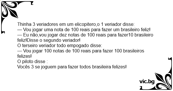 — Eu não,vou jogar dez notas de 100 reais para fazer10 brasileiro feliz!Disse o segundo veriador!