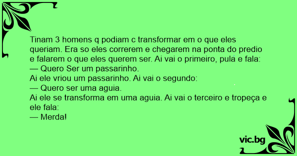 Tinam 3 homens q podiam c transformar em o que eles queriam. Era so eles correrem e chegarem na ponta do predio e falarem o que eles querem ser. Ai vai o primeiro, pula e fala: