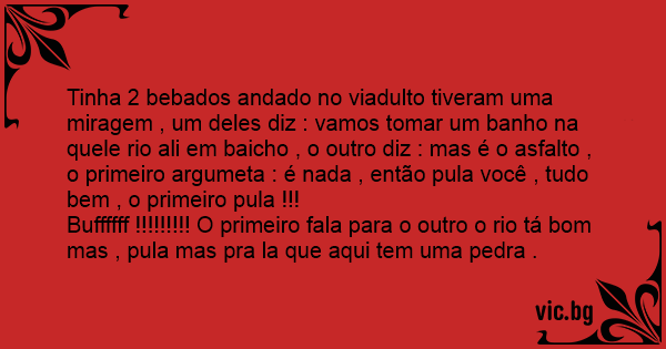 Tinha 2 bebados andado no viadulto tiveram uma miragem , um deles diz : vamos tomar um banho na quele rio ali em baicho , o outro diz : mas é o asfalto , o primeiro argumeta : é nada , então pula você , tudo bem , o primeiro pula !!!