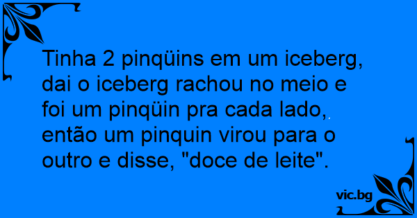 Tinha 2 pinqüins em um iceberg, dai o iceberg rachou no meio e foi um pinqüin pra cada lado, então um pinquin virou para o outro e disse, "doce de leite".