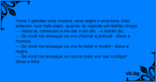 Tinha 3 garotas uma morena, uma nеgrа e uma loira. Elas estavam num bate papo, quando de repente um ladrão chega: