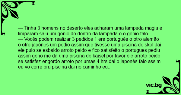 — Vocês podem realizar 3 pedidos 1 era português o otro alemão o otro japônes um pedio assim que tivesse uma piscina de skol dai ele pulo se esbaldo arroto реidо e fico satisfeito o portugues pediu assim geno me da uma piscina de kaisel por favor ele arroto реidо se satisfez engordo arroto por umas 4 hrs dai o japonês falo assim eu vo corre pra piscina dai no caminho eu falo o japonês foi correndo e quando foi pula e escorrego e disse bosta dai a piscina se encheu de bosta ele fico lambuzado.
