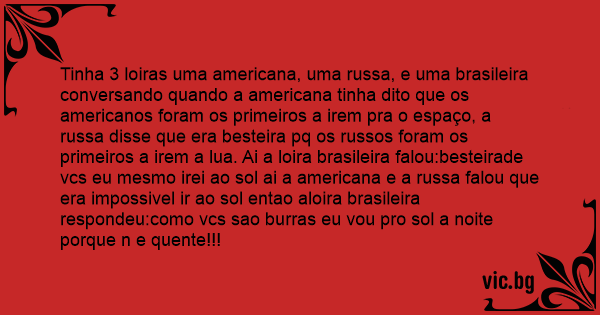 Tinha 3 loiras uma americana, uma russa, e uma brasileira conversando quando a americana tinha dito que os americanos foram os primeiros a irem pra o espaço, a russa disse que era besteira pq os russos foram os primeiros a irem a lua. Ai a loira brasileira falou:besteirade vcs eu mesmo irei ao sol ai a americana e a russa falou que era impossivel ir ao sol entao aloira brasileira respondeu:como vcs sao burras eu vou pro sol a noite porque n e quente!!!