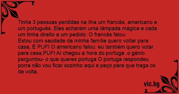 Tinha 3 pessoas perdidas na ilha um francês, americano e um português. Eles acharam uma lâmpada mágica e cada um tinha direito a um pedido. O francês falou:
