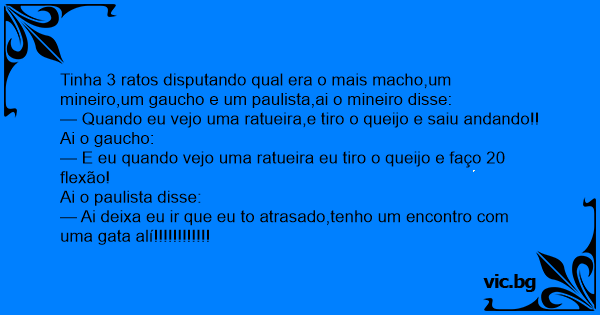 Tinha 3 ratos disputando qual era o mais macho,um mineiro,um gaucho e um paulista,ai o mineiro disse: