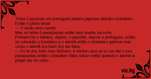 Primeiro foi o italiano, depois, o japonês, depois o portugues, então só sobrarão o brasileiro e o alemã então o brasileiro ganhou mas como o alemã era bem rico ele falou: