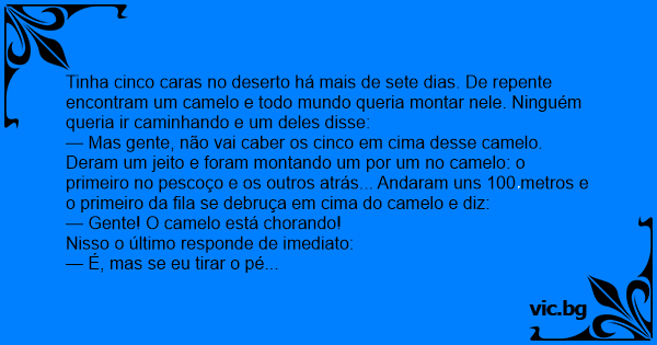 Tinha cinco caras no deserto há mais de sete dias. De repente encontram um camelo e todo mundo queria montar nele. Ninguém queria ir caminhando e um deles disse: — Mas gente, não vai caber os cinco em cima desse camelo. Deram um jeito e foram montando um por um no camelo: o primeiro no pescoço e os outros atrás... Andaram uns 100 metros e o primeiro da fila se debruça em cima do camelo e diz: — Gente! O camelo está chorando! Nisso o último responde de imediato: — É, mas se eu tirar o pé daqui eu caio!
