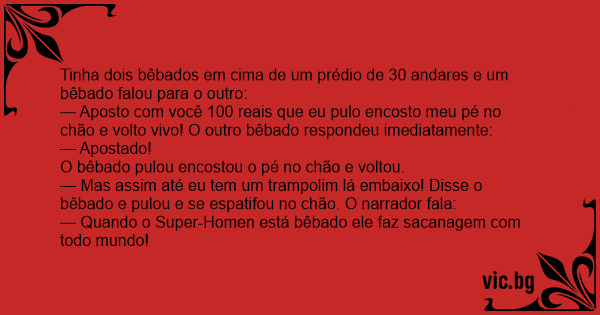 — Mas assim até eu tem um trampolim lá embaixo! Disse o bêbado e pulou e se espatifou no chão. O narrador fala: